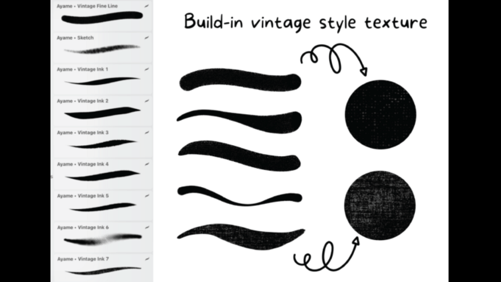 Create vintage art style with Vintage ink iBox brush set with custom procreate ink brushes which has build-in texture and variety of choices, procreate pattern brushes with hand drawn custom design by Ayamehoon and Smeared ink pattern imitate traditional art work