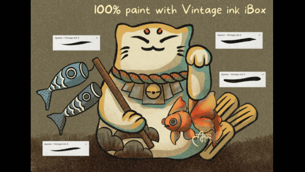 Create vintage art style with Vintage ink iBox brush set with custom procreate ink brushes which has build-in texture and variety of choices, procreate pattern brushes with hand drawn custom design by Ayamehoon and Smeared ink pattern imitate traditional art work